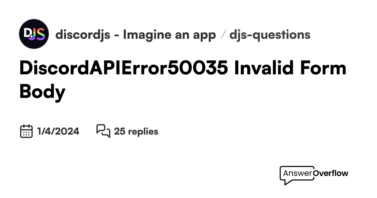 Learn how to fix the discord sticker invalid form body error with this easy guide. This error occurs when you try to. An invalid form body in discord.js is a json object that does not meet the required format for a discord form. Support server for discord.js, a node.js module to interact with discords apps api. This can happen if.