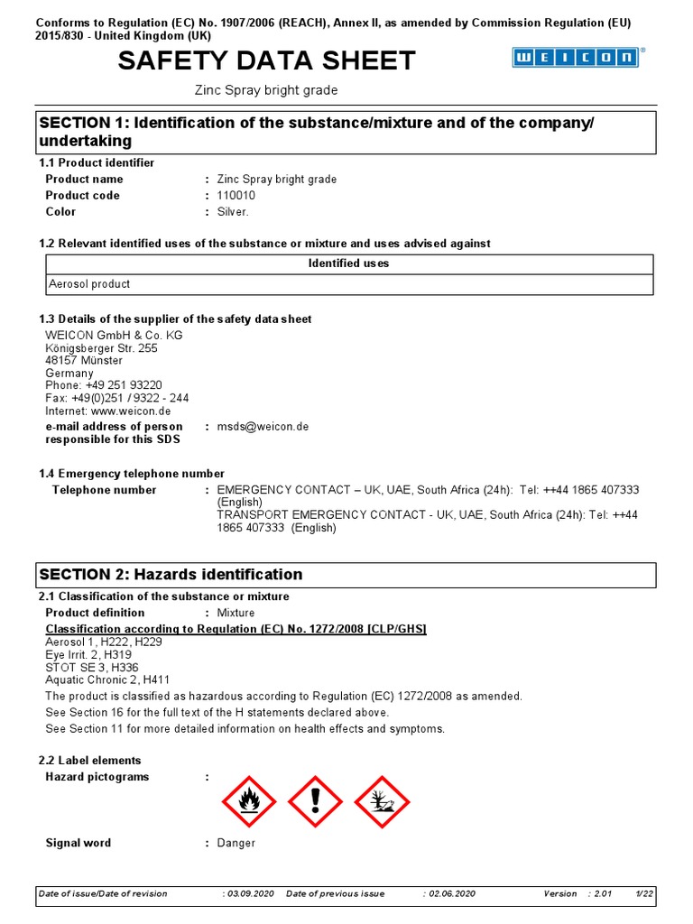 Weicon Zinc Spray 110010 MSDS PDF Occupational Safety And Health